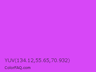 YUV 134.12,55.65,70.932 Color is a light purple color and the nearest color is Heliotrope #df73ff. Hex code #d747f7 and RGB value is rgb(215,71,247). In RGB color space, this color is composed of 84% red, 28% green, 97% blue, In CMYK color space, this color is composed of 13% cyan, 71% magenta, 0% yellow , 3% black , In HSL color space, this color has a hue angle of 289° , 92% saturation and 62% lightness.
