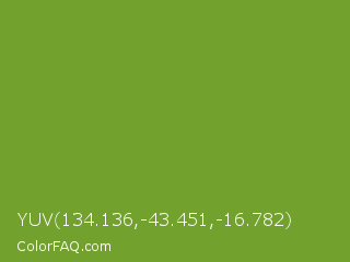 YUV 134.136,-43.451,-16.782 Color is a normal green color and the nearest color is Palm Leaf #6f9940. Hex code #73a12e and RGB value is rgb(115,161,46). In RGB color space, this color is composed of 45% red, 63% green, 18% blue, In CMYK color space, this color is composed of 29% cyan, 0% magenta, 71% yellow , 37% black , In HSL color space, this color has a hue angle of 84° , 56% saturation and 41% lightness.
