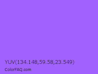 YUV 134.148,59.58,23.549 Color is a light violet color and the nearest color is Navy Purple #9457eb. Hex code #a161ff and RGB value is rgb(161,97,255). In RGB color space, this color is composed of 63% red, 38% green, 100% blue, In CMYK color space, this color is composed of 37% cyan, 62% magenta, 0% yellow , 0% black , In HSL color space, this color has a hue angle of 264° , 100% saturation and 69% lightness.