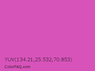 YUV 134.21,25.532,70.853 Color is a normal magenta color and the nearest color is Fuchsia Pink #c154c1. Hex code #d753ba and RGB value is rgb(215,83,186). In RGB color space, this color is composed of 84% red, 33% green, 73% blue, In CMYK color space, this color is composed of 0% cyan, 61% magenta, 13% yellow , 16% black , In HSL color space, this color has a hue angle of 313° , 62% saturation and 58% lightness.