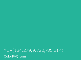 YUV 134.279,9.722,-85.314 Color is a normal cyan color and the nearest color is Mountain Meadow #30ba8f. Hex code #25b49a and RGB value is rgb(37,180,154). In RGB color space, this color is composed of 15% red, 71% green, 60% blue, In CMYK color space, this color is composed of 79% cyan, 0% magenta, 14% yellow , 29% black , In HSL color space, this color has a hue angle of 169° , 66% saturation and 43% lightness.
