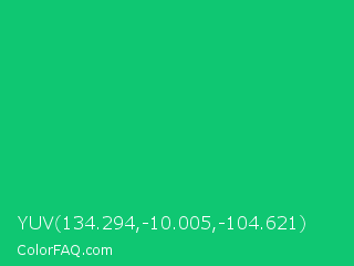 YUV 134.294,-10.005,-104.621 Color is a normal green color and the nearest color is Mountain Meadow Crayola #1ab385. Hex code #0fc772 and RGB value is rgb(15,199,114). In RGB color space, this color is composed of 6% red, 78% green, 45% blue, In CMYK color space, this color is composed of 92% cyan, 0% magenta, 43% yellow , 22% black , In HSL color space, this color has a hue angle of 152° , 86% saturation and 42% lightness.