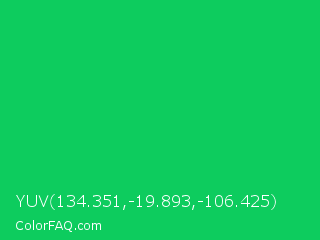 YUV 134.351,-19.893,-106.425 Color is a normal green color and the nearest color is Malachite #0bda51. Hex code #0dcc5e and RGB value is rgb(13,204,94). In RGB color space, this color is composed of 5% red, 80% green, 37% blue, In CMYK color space, this color is composed of 94% cyan, 0% magenta, 54% yellow , 20% black , In HSL color space, this color has a hue angle of 145° , 88% saturation and 43% lightness.