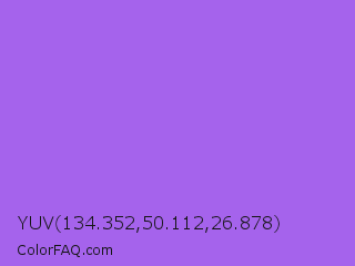YUV 134.352,50.112,26.878 Color is a light violet color and the nearest color is Navy Purple #9457eb. Hex code #a563ec and RGB value is rgb(165,99,236). In RGB color space, this color is composed of 65% red, 39% green, 93% blue, In CMYK color space, this color is composed of 30% cyan, 58% magenta, 0% yellow , 7% black , In HSL color space, this color has a hue angle of 269° , 78% saturation and 66% lightness.