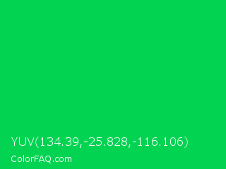 YUV 134.39,-25.828,-116.106 Color is a normal green color and the nearest color is Malachite #0bda51. Hex code #02d452 and RGB value is rgb(2,212,82). In RGB color space, this color is composed of 1% red, 83% green, 32% blue, In CMYK color space, this color is composed of 99% cyan, 0% magenta, 61% yellow , 17% black , In HSL color space, this color has a hue angle of 143° , 98% saturation and 42% lightness.
