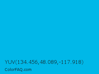YUV 134.456,48.089,-117.918 Color is a normal cyan color and the nearest color is Cyan Process #00b7eb. Hex code #00b8e8 and RGB value is rgb(0,184,232). In RGB color space, this color is composed of 0% red, 72% green, 91% blue, In CMYK color space, this color is composed of 100% cyan, 21% magenta, 0% yellow , 9% black , In HSL color space, this color has a hue angle of 192° , 100% saturation and 45% lightness.
