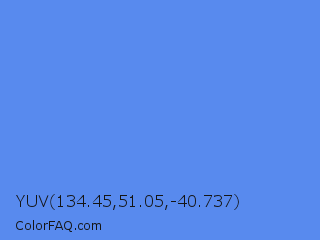 YUV 134.45,51.05,-40.737 Color is a light blue color and the nearest color is United Nations Blue #5b92e5. Hex code #588aee and RGB value is rgb(88,138,238). In RGB color space, this color is composed of 35% red, 54% green, 93% blue, In CMYK color space, this color is composed of 63% cyan, 42% magenta, 0% yellow , 7% black , In HSL color space, this color has a hue angle of 220° , 82% saturation and 64% lightness.