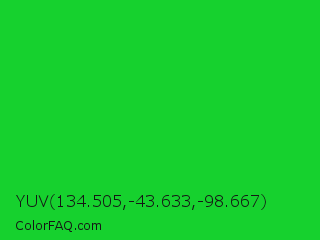 YUV 134.505,-43.633,-98.667 Color is a normal green color and the nearest color is Vivid Malachite #00cc33. Hex code #16d12e and RGB value is rgb(22,209,46). In RGB color space, this color is composed of 9% red, 82% green, 18% blue, In CMYK color space, this color is composed of 89% cyan, 0% magenta, 78% yellow , 18% black , In HSL color space, this color has a hue angle of 128° , 81% saturation and 45% lightness.