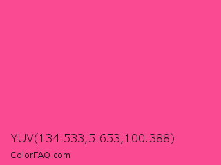 YUV 134.533,5.653,100.388 Color is a light rose color and the nearest color is French Rose #f64a8a. Hex code #f94a92 and RGB value is rgb(249,74,146). In RGB color space, this color is composed of 98% red, 29% green, 57% blue, In CMYK color space, this color is composed of 0% cyan, 70% magenta, 41% yellow , 2% black , In HSL color space, this color has a hue angle of 335° , 94% saturation and 63% lightness.