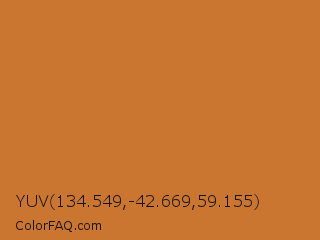 YUV 134.549,-42.669,59.155 Color is a normal orange color and the nearest color is Bronze #cd7f32. Hex code #ca7530 and RGB value is rgb(202,117,48). In RGB color space, this color is composed of 79% red, 46% green, 19% blue, In CMYK color space, this color is composed of 0% cyan, 42% magenta, 76% yellow , 21% black , In HSL color space, this color has a hue angle of 27° , 62% saturation and 49% lightness.