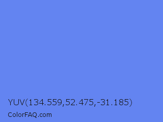 YUV 134.559,52.475,-31.185 Color is a light blue color and the nearest color is Cornflower Blue #6495ed. Hex code #6384f1 and RGB value is rgb(99,132,241). In RGB color space, this color is composed of 39% red, 52% green, 95% blue, In CMYK color space, this color is composed of 59% cyan, 45% magenta, 0% yellow , 5% black , In HSL color space, this color has a hue angle of 226° , 84% saturation and 67% lightness.