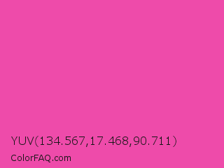 YUV 134.567,17.468,90.711 Color is a light magenta color and the nearest color is Brilliant Rose #f653a6. Hex code #ee4baa and RGB value is rgb(238,75,170). In RGB color space, this color is composed of 93% red, 29% green, 67% blue, In CMYK color space, this color is composed of 0% cyan, 68% magenta, 29% yellow , 7% black , In HSL color space, this color has a hue angle of 325° , 83% saturation and 61% lightness.