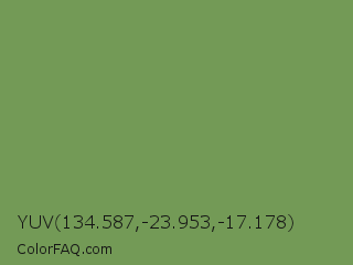 YUV 134.587,-23.953,-17.178 Color is a normal green color and the nearest color is Asparagus Green #7ba05b. Hex code #739a56 and RGB value is rgb(115,154,86). In RGB color space, this color is composed of 45% red, 60% green, 34% blue, In CMYK color space, this color is composed of 25% cyan, 0% magenta, 44% yellow , 40% black , In HSL color space, this color has a hue angle of 94° , 28% saturation and 47% lightness.