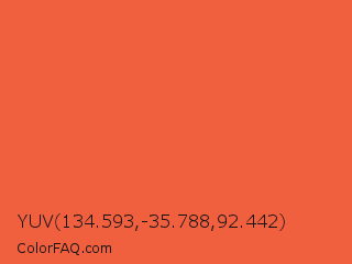 YUV 134.593,-35.788,92.442 Color is a normal red color and the nearest color is Orange Soda #fa5b3d. Hex code #f05f3e and RGB value is rgb(240,95,62). In RGB color space, this color is composed of 94% red, 37% green, 24% blue, In CMYK color space, this color is composed of 0% cyan, 60% magenta, 74% yellow , 6% black , In HSL color space, this color has a hue angle of 11° , 86% saturation and 59% lightness.