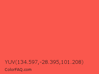 YUV 134.597,-28.395,101.208 Color is a light red color and the nearest color is Red Orange #ff5349. Hex code #fa574d and RGB value is rgb(250,87,77). In RGB color space, this color is composed of 98% red, 34% green, 30% blue, In CMYK color space, this color is composed of 0% cyan, 65% magenta, 69% yellow , 2% black , In HSL color space, this color has a hue angle of 3° , 95% saturation and 64% lightness.