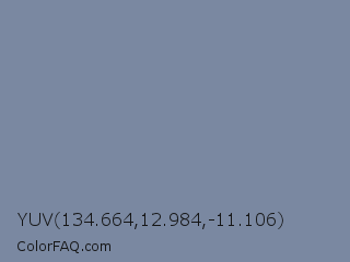 YUV 134.664,12.984,-11.106 Color is a normal blue color and the nearest color is Shadow Blue #778ba5. Hex code #7a88a1 and RGB value is rgb(122,136,161). In RGB color space, this color is composed of 48% red, 53% green, 63% blue, In CMYK color space, this color is composed of 24% cyan, 16% magenta, 0% yellow , 37% black , In HSL color space, this color has a hue angle of 218° , 17% saturation and 55% lightness.