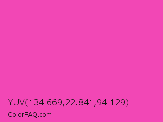 YUV 134.669,22.841,94.129 Color is a light magenta color and the nearest color is Brilliant Rose #f653a6. Hex code #f247b5 and RGB value is rgb(242,71,181). In RGB color space, this color is composed of 95% red, 28% green, 71% blue, In CMYK color space, this color is composed of 0% cyan, 71% magenta, 25% yellow , 5% black , In HSL color space, this color has a hue angle of 321° , 87% saturation and 61% lightness.