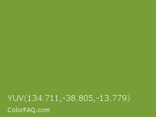 YUV 134.711,-38.805,-13.779 Color is a normal green color and the nearest color is Palm Leaf #6f9940. Hex code #779e38 and RGB value is rgb(119,158,56). In RGB color space, this color is composed of 47% red, 62% green, 22% blue, In CMYK color space, this color is composed of 25% cyan, 0% magenta, 65% yellow , 38% black , In HSL color space, this color has a hue angle of 83° , 48% saturation and 42% lightness.