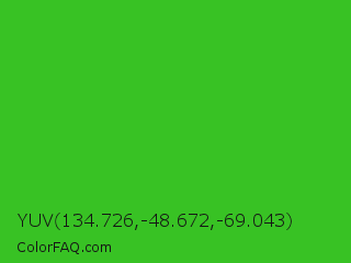 YUV 134.726,-48.672,-69.043 Color is a normal green color and the nearest color is Lime Green #32cd32. Hex code #38c224 and RGB value is rgb(56,194,36). In RGB color space, this color is composed of 22% red, 76% green, 14% blue, In CMYK color space, this color is composed of 71% cyan, 0% magenta, 81% yellow , 24% black , In HSL color space, this color has a hue angle of 112° , 69% saturation and 45% lightness.