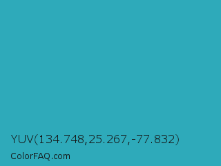 YUV 134.748,25.267,-77.832 Color is a normal cyan color and the nearest color is Pelorous #3eabbf. Hex code #2eaaba and RGB value is rgb(46,170,186). In RGB color space, this color is composed of 18% red, 67% green, 73% blue, In CMYK color space, this color is composed of 75% cyan, 9% magenta, 0% yellow , 27% black , In HSL color space, this color has a hue angle of 187° , 60% saturation and 45% lightness.