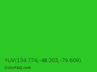 YUV 134.774,-48.203,-79.609 Color is a normal green color and the nearest color is Lime Green #32cd32. Hex code #2cc825 and RGB value is rgb(44,200,37). In RGB color space, this color is composed of 17% red, 78% green, 15% blue, In CMYK color space, this color is composed of 78% cyan, 0% magenta, 82% yellow , 22% black , In HSL color space, this color has a hue angle of 117° , 69% saturation and 46% lightness.