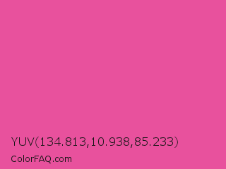 YUV 134.813,10.938,85.233 Color is a light rose color and the nearest color is Raspberry Pink #e25098. Hex code #e8519d and RGB value is rgb(232,81,157). In RGB color space, this color is composed of 91% red, 32% green, 62% blue, In CMYK color space, this color is composed of 0% cyan, 65% magenta, 32% yellow , 9% black , In HSL color space, this color has a hue angle of 330° , 77% saturation and 61% lightness.