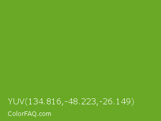 YUV 134.816,-48.223,-26.149 Color is a normal green color and the nearest color is Green RYB #66b032. Hex code #69a925 and RGB value is rgb(105,169,37). In RGB color space, this color is composed of 41% red, 66% green, 15% blue, In CMYK color space, this color is composed of 38% cyan, 0% magenta, 78% yellow , 34% black , In HSL color space, this color has a hue angle of 89° , 64% saturation and 40% lightness.