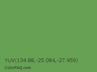YUV 134.88,-25.084,-27.959 Color is a normal green color and the nearest color is Asparagus Green #7ba05b. Hex code #67a154 and RGB value is rgb(103,161,84). In RGB color space, this color is composed of 40% red, 63% green, 33% blue, In CMYK color space, this color is composed of 36% cyan, 0% magenta, 48% yellow , 37% black , In HSL color space, this color has a hue angle of 105° , 31% saturation and 48% lightness.