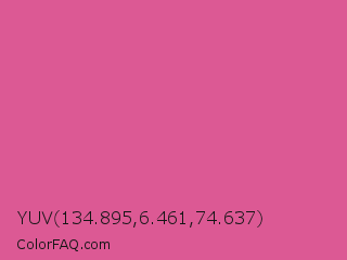 YUV 134.895,6.461,74.637 Color is a light rose color and the nearest color is Raspberry Pink #e25098. Hex code #dc5994 and RGB value is rgb(220,89,148). In RGB color space, this color is composed of 86% red, 35% green, 58% blue, In CMYK color space, this color is composed of 0% cyan, 60% magenta, 33% yellow , 14% black , In HSL color space, this color has a hue angle of 333° , 65% saturation and 61% lightness.