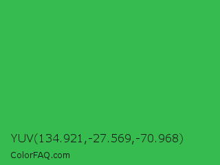 YUV 134.921,-27.569,-70.968 Color is a normal green color and the nearest color is Chateau Green #40a860. Hex code #36bb4f and RGB value is rgb(54,187,79). In RGB color space, this color is composed of 21% red, 73% green, 31% blue, In CMYK color space, this color is composed of 71% cyan, 0% magenta, 58% yellow , 27% black , In HSL color space, this color has a hue angle of 131° , 55% saturation and 47% lightness.