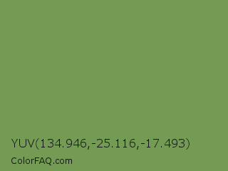 YUV 134.946,-25.116,-17.493 Color is a normal green color and the nearest color is Asparagus Green #7ba05b. Hex code #739b54 and RGB value is rgb(115,155,84). In RGB color space, this color is composed of 45% red, 61% green, 33% blue, In CMYK color space, this color is composed of 26% cyan, 0% magenta, 46% yellow , 39% black , In HSL color space, this color has a hue angle of 94° , 30% saturation and 47% lightness.