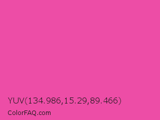 YUV 134.986,15.29,89.466 Color is a light magenta color and the nearest color is Brilliant Rose #f653a6. Hex code #ed4da6 and RGB value is rgb(237,77,166). In RGB color space, this color is composed of 93% red, 30% green, 65% blue, In CMYK color space, this color is composed of 0% cyan, 68% magenta, 30% yellow , 7% black , In HSL color space, this color has a hue angle of 327° , 82% saturation and 62% lightness.