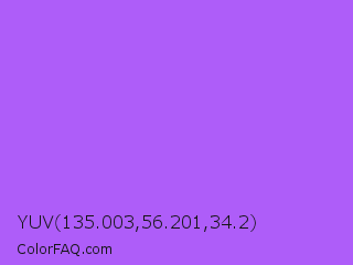 YUV 135.003,56.201,34.2 Color is a light purple color and the nearest color is Navy Purple #9457eb. Hex code #ae5df9 and RGB value is rgb(174,93,249). In RGB color space, this color is composed of 68% red, 36% green, 98% blue, In CMYK color space, this color is composed of 30% cyan, 63% magenta, 0% yellow , 2% black , In HSL color space, this color has a hue angle of 271° , 93% saturation and 67% lightness.