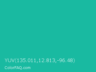 YUV 135.011,12.813,-96.48 Color is a normal cyan color and the nearest color is Light Sea Green #20b2aa. Hex code #19baa1 and RGB value is rgb(25,186,161). In RGB color space, this color is composed of 10% red, 73% green, 63% blue, In CMYK color space, this color is composed of 87% cyan, 0% magenta, 13% yellow , 27% black , In HSL color space, this color has a hue angle of 171° , 76% saturation and 41% lightness.