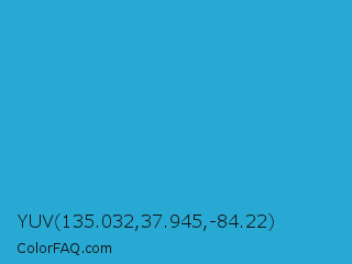 YUV 135.032,37.945,-84.22 Color is a normal blue color and the nearest color is Ball Blue #21abcd. Hex code #27a9d4 and RGB value is rgb(39,169,212). In RGB color space, this color is composed of 15% red, 66% green, 83% blue, In CMYK color space, this color is composed of 82% cyan, 20% magenta, 0% yellow , 17% black , In HSL color space, this color has a hue angle of 195° , 69% saturation and 49% lightness.