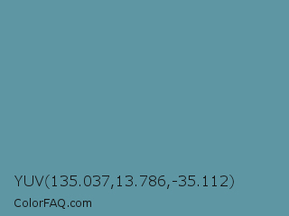 YUV 135.037,13.786,-35.112 Color is a normal cyan color and the nearest color is Cadet Blue #5f9ea0. Hex code #5f96a3 and RGB value is rgb(95,150,163). In RGB color space, this color is composed of 37% red, 59% green, 64% blue, In CMYK color space, this color is composed of 42% cyan, 8% magenta, 0% yellow , 36% black , In HSL color space, this color has a hue angle of 191° , 27% saturation and 51% lightness.