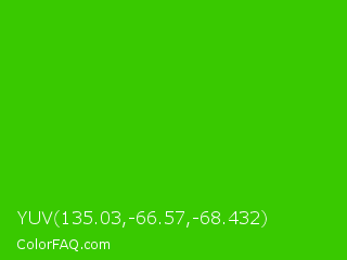 YUV 135.03,-66.57,-68.432 Color is a normal green color and the nearest color is Harlequin Green #46cb18. Hex code #39c900 and RGB value is rgb(57,201,-0). In RGB color space, this color is composed of 22% red, 79% green, 0% blue, In CMYK color space, this color is composed of 72% cyan, 0% magenta, 100% yellow , 21% black , In HSL color space, this color has a hue angle of 103° , 100% saturation and 39% lightness.
