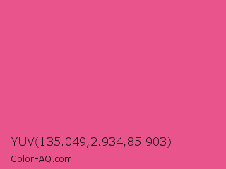 YUV 135.049,2.934,85.903 Color is a light rose color and the nearest color is Dark Pink #e75480. Hex code #e9548d and RGB value is rgb(233,84,141). In RGB color space, this color is composed of 91% red, 33% green, 55% blue, In CMYK color space, this color is composed of 0% cyan, 64% magenta, 39% yellow , 9% black , In HSL color space, this color has a hue angle of 337° , 77% saturation and 62% lightness.