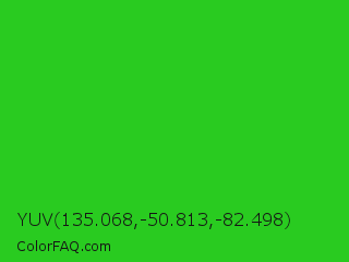 YUV 135.068,-50.813,-82.498 Color is a normal green color and the nearest color is Lime Green #32cd32. Hex code #29cb20 and RGB value is rgb(41,203,32). In RGB color space, this color is composed of 16% red, 80% green, 13% blue, In CMYK color space, this color is composed of 80% cyan, 0% magenta, 84% yellow , 20% black , In HSL color space, this color has a hue angle of 117° , 73% saturation and 46% lightness.