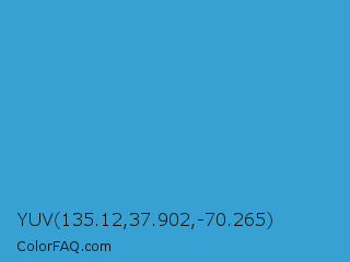 YUV 135.12,37.902,-70.265 Color is a normal blue color and the nearest color is Maximum Blue #47abcc. Hex code #37a1d4 and RGB value is rgb(55,161,212). In RGB color space, this color is composed of 22% red, 63% green, 83% blue, In CMYK color space, this color is composed of 74% cyan, 24% magenta, 0% yellow , 17% black , In HSL color space, this color has a hue angle of 199° , 65% saturation and 52% lightness.