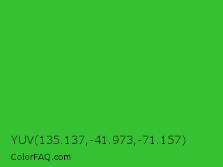 YUV 135.137,-41.973,-71.157 Color is a normal green color and the nearest color is Lime Green #32cd32. Hex code #36c132 and RGB value is rgb(54,193,50). In RGB color space, this color is composed of 21% red, 76% green, 20% blue, In CMYK color space, this color is composed of 72% cyan, 0% magenta, 74% yellow , 24% black , In HSL color space, this color has a hue angle of 118° , 59% saturation and 48% lightness.