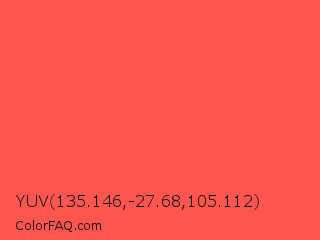 YUV 135.146,-27.68,105.112 Color is a light red color and the nearest color is Red Orange #ff5349. Hex code #ff554f and RGB value is rgb(255,85,79). In RGB color space, this color is composed of 100% red, 33% green, 31% blue, In CMYK color space, this color is composed of 0% cyan, 67% magenta, 69% yellow , 0% black , In HSL color space, this color has a hue angle of 2° , 100% saturation and 65% lightness.