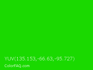 YUV 135.153,-66.63,-95.727 Color is a normal green color and the nearest color is Green #00ff00. Hex code #1ad900 and RGB value is rgb(26,217,-0). In RGB color space, this color is composed of 10% red, 85% green, 0% blue, In CMYK color space, this color is composed of 88% cyan, 0% magenta, 100% yellow , 15% black , In HSL color space, this color has a hue angle of 113° , 100% saturation and 43% lightness.
