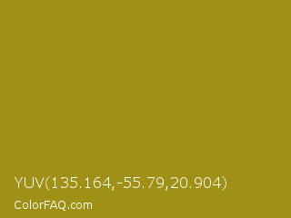 YUV 135.164,-55.79,20.904 Color is a normal yellow color and the nearest color is Dark Yellow #9b870c. Hex code #9f9116 and RGB value is rgb(159,145,22). In RGB color space, this color is composed of 62% red, 57% green, 9% blue, In CMYK color space, this color is composed of 0% cyan, 9% magenta, 86% yellow , 38% black , In HSL color space, this color has a hue angle of 54° , 76% saturation and 35% lightness.