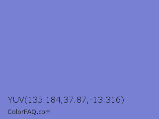 YUV 135.184,37.87,-13.316 Color is a light blue color and the nearest color is Moody Blue #7f76d3. Hex code #7880d4 and RGB value is rgb(120,128,212). In RGB color space, this color is composed of 47% red, 50% green, 83% blue, In CMYK color space, this color is composed of 43% cyan, 40% magenta, 0% yellow , 17% black , In HSL color space, this color has a hue angle of 235° , 52% saturation and 65% lightness.