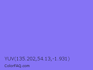YUV 135.202,54.13,-1.931 Color is a light indigo color and the nearest color is Medium Slate Blue #7b68ee. Hex code #8573f5 and RGB value is rgb(133,115,245). In RGB color space, this color is composed of 52% red, 45% green, 96% blue, In CMYK color space, this color is composed of 46% cyan, 53% magenta, 0% yellow , 4% black , In HSL color space, this color has a hue angle of 248° , 87% saturation and 71% lightness.