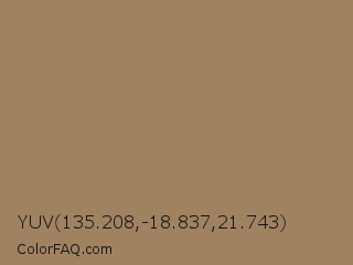 YUV 135.208,-18.837,21.743 Color is a normal orange color and the nearest color is French Beige #a67b5b. Hex code #a08261 and RGB value is rgb(160,130,97). In RGB color space, this color is composed of 63% red, 51% green, 38% blue, In CMYK color space, this color is composed of 0% cyan, 19% magenta, 39% yellow , 37% black , In HSL color space, this color has a hue angle of 31° , 25% saturation and 50% lightness.