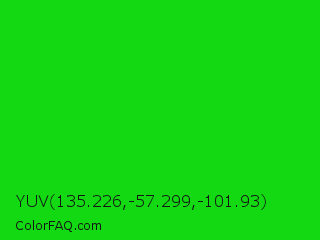YUV 135.226,-57.299,-101.93 Color is a normal green color and the nearest color is Vivid Malachite #00cc33. Hex code #13d913 and RGB value is rgb(19,217,19). In RGB color space, this color is composed of 7% red, 85% green, 7% blue, In CMYK color space, this color is composed of 91% cyan, 0% magenta, 91% yellow , 15% black , In HSL color space, this color has a hue angle of 120° , 84% saturation and 46% lightness.