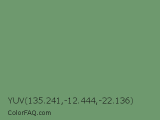 YUV 135.241,-12.444,-22.136 Color is a normal green color and the nearest color is Russian Green #679267. Hex code #6e996e and RGB value is rgb(110,153,110). In RGB color space, this color is composed of 43% red, 60% green, 43% blue, In CMYK color space, this color is composed of 28% cyan, 0% magenta, 28% yellow , 40% black , In HSL color space, this color has a hue angle of 120° , 17% saturation and 52% lightness.