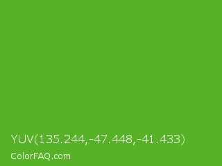 YUV 135.244,-47.448,-41.433 Color is a normal green color and the nearest color is Green RYB #66b032. Hex code #58b227 and RGB value is rgb(88,178,39). In RGB color space, this color is composed of 35% red, 70% green, 15% blue, In CMYK color space, this color is composed of 51% cyan, 0% magenta, 78% yellow , 30% black , In HSL color space, this color has a hue angle of 99° , 64% saturation and 43% lightness.